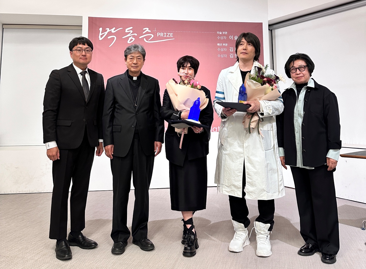 왼쪽부터) 유족대표 박중구 변호사, 천주교대구대교구 조환길 타대오 대주교님, 김민 디자이너, 김재우 디자이너, 이슬기 작가, 윤순영 이사장님