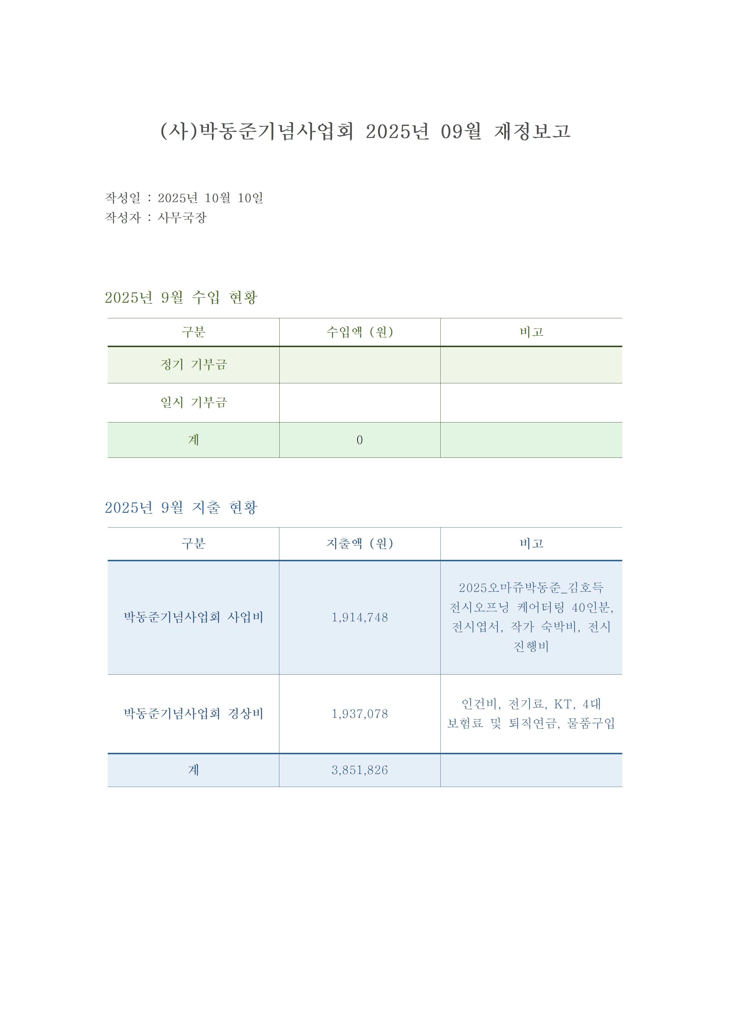 이사장 인사말설립취지사업목적디자이너 박동준조직 및 구성정기총회기부 및 공시 안내오시는 길 재정보고기부안내기부신청기부자현황재정보고공익법인 공시 제목2025년 09월 재정보고2025-12-10 12:18작성자박동준기념사업회 목록이전2025년 10월 재정보고박동준기념사업회 2025-12-10-2025년 09월 재정보고박동준기념사업회 2025-12-10다음2025년 08월 재정보고박동준기념사업회 2025-12-10 Powered by MangBoard